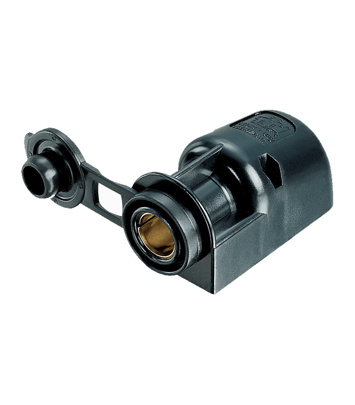 Aufbau-Steckdose mit Deckel. Passend für Norm- und Universalstecker, max. 16 A/6-24 V. Anschluss mit Flachsteckern 6,3 mm.