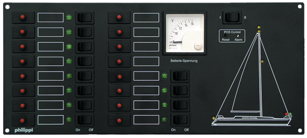 Kombinierter Stromkreisverteiler mit Positionslampen-Überwachung und Alarm für Segelyachten, 12 Stromkreise mit thermischen Schutzschaltern 8A, Wippschaltern, Leuchtdiodenanzeige, sowie 4 zusätzlichen thermischen Schutzschaltern 8 A. Voltmeter mit Umschalter, Drehspulmesswerk Klasse 1,5 Integrierte Überwachungselektronik mit Alarm.
