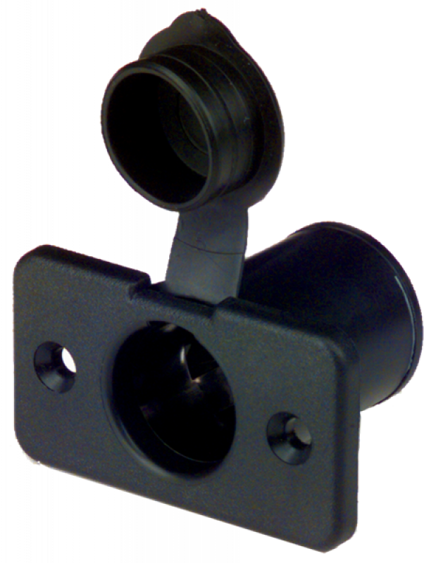 Einbausteckdose analog zu Zigarettenanzünder mit Deckel und rechteckigem Befestigungsflansch. Erforderlicher Einbauloch Ø 28 mm. Passend für Stecker Ø 21 mm. Anschluss mit Flachsteckern 6,3 mm. Strombelastbarkeit 16 A.