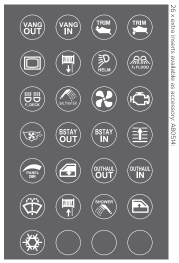 Der Satz enthält eine Auswahl zusätzlicher Symbolbeschriftungen, die speziell für typische Anwendungen auf Segel- und Motoryachten entwickelt wurden. Dadurch können weitere Systeme und Funktionen übersichtlich und intuitiv gesteuert werden. Dies erleichtert die Bedienung und sorgt für eine klare Zuordnung der jeweiligen Steuerbefehle.