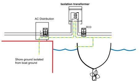 Die beste Lösung zur Verhinderung galvanischer Korrosion bei gleichzeitiger Wahrung aller Sicherheitsaspekte wird mit dem Einbau eines Trenntransformators erreicht. Damit ist die vollständige galvanische Trennung vom Landnetz gesichert. Der Landstrom liegt auf der Primärwicklung und das Bordnetz auf der Sekundärwicklung. Das Übersetzungsverhältnis ist dabei natürlich 1:1. Alle Sicherungssysteme des Bordnetzes arbeiten getrennt und unabhängig vom Landstrom.