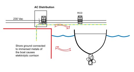 Es ist ein Fehler anzunehmen, daß galvanische Korrosion nur bei Aluminium- oder Stahlschiffen auftreten kann. In Wirklichkeit betrifft sie alle Schiffe sobald Metallteile wie z.B. der Propeller und die Welle, oder metallene Außenhautdurchführungen mit Wasser in Kontakt kommen, und das Schiff über den Landanschluß geerdet ist. Es mag verlockend sein beim Landanschluß auf den Schutzleiters zu verzichten: das ist allerdings höchst gefährlich für die Personen an Bord, da die Schutzeinrichtungen dann nicht mehr ansprechen (s.o.).