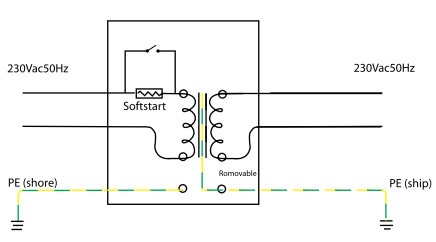Mit einem Trenntransformator wird eine vollständige galvanische Trennung zwischen Schiff und Landnetz erreicht. Er erhöht die Sicherheit, macht galvanische Isolatoren überflüssig und verhindert Polaritätsprobleme.