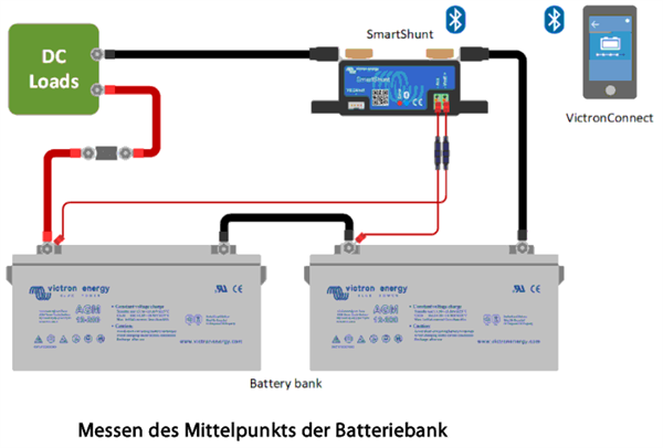 Alternativ kann der SmartShunt angeschlossen und von einem GX-Gerät gelesen werden. Der Anschluss an den SmartShunt erfolgt über ein VE.Direct-Kabel.